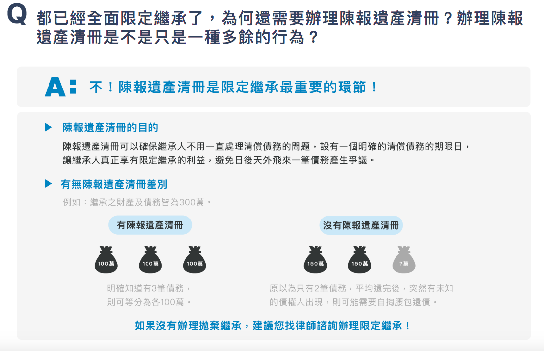 舉例來說:繼承到的財產以及債務各有300萬元,若有陳報遺產清冊,明確知道各有三筆債務,各分100萬元償還便了結;若沒有陳報遺產清冊,原本以為只有兩筆債務,各分到150萬元還完後,幾年後的某天,突然出現一個未知的債權人說還有債務沒有還清,這時候就有可能要自掏腰包來償還了。