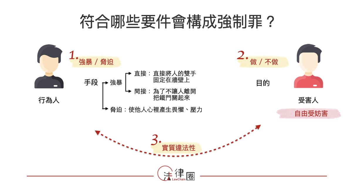 「強制罪」訂於我國刑法304 條,是指行為人以「強暴」、「脅迫」的方式,使別人做沒有義務的事,或妨害他人行使權利。「強制罪」所保護的是個人意思形成的自由、個人意思決定的自由,以及依照意思決定而「去做什麼」或「不做什麼」的行動自由;分析強制罪的犯罪構成要件,當行為人的行為符合下面兩個要件時,就要當心構成強制罪的可罰性行為: