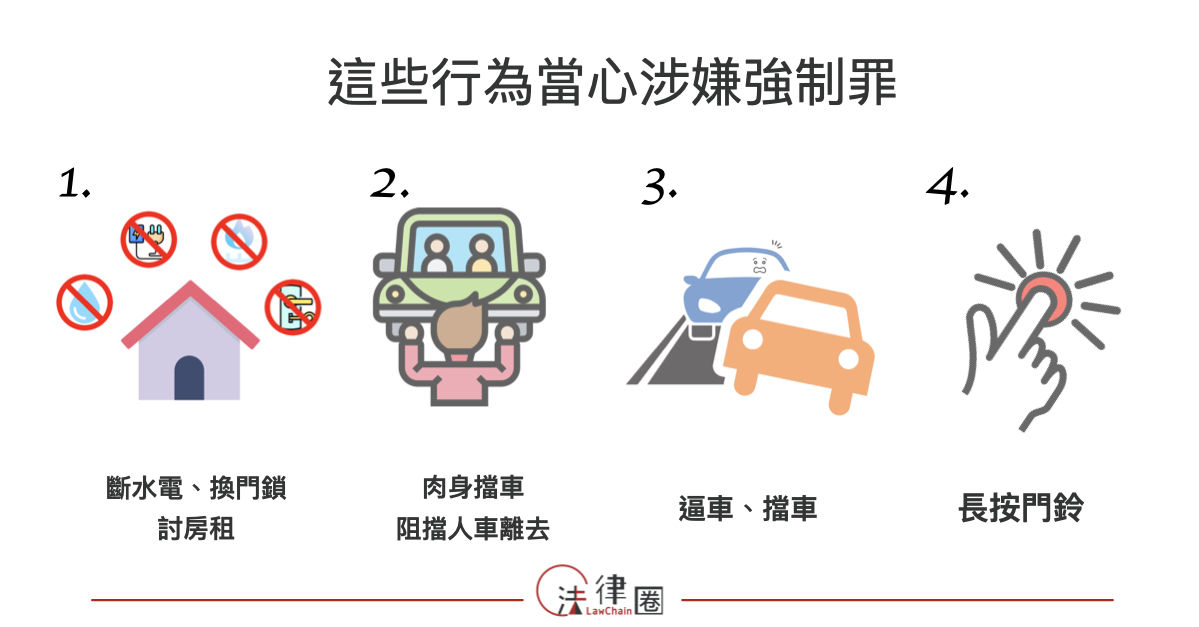 如同前面所說的,強制罪中的「強暴」與「脅迫」的要件認定的標準很寬鬆,很容易就會達成,因此生活中有很多干擾對方的行為,只要達到暴力脅迫、干擾他人自由都可能會觸法!