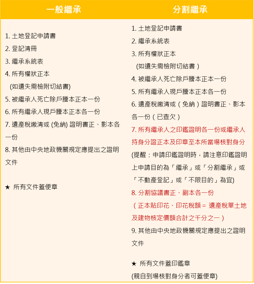 除準備繼承登記之文件外,應另行檢附遺產分割協議書正副本各1份,正本並貼足不動產權利價值總額1/1000之印花稅,及全體繼承人之印鑑證明
