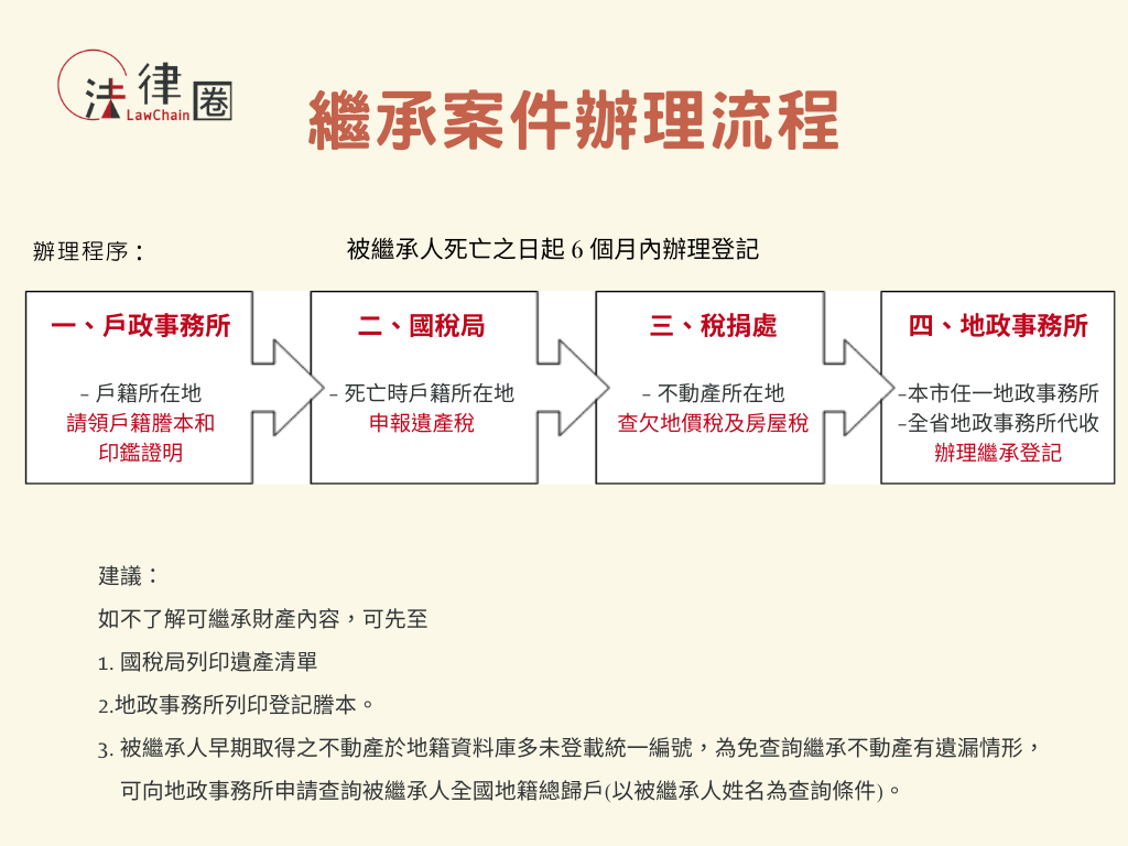 1. 至戶政事務所,申請被繼承人死亡除戶之戶籍謄本,與各繼承人現戶戶籍謄本(及印鑑證明)。