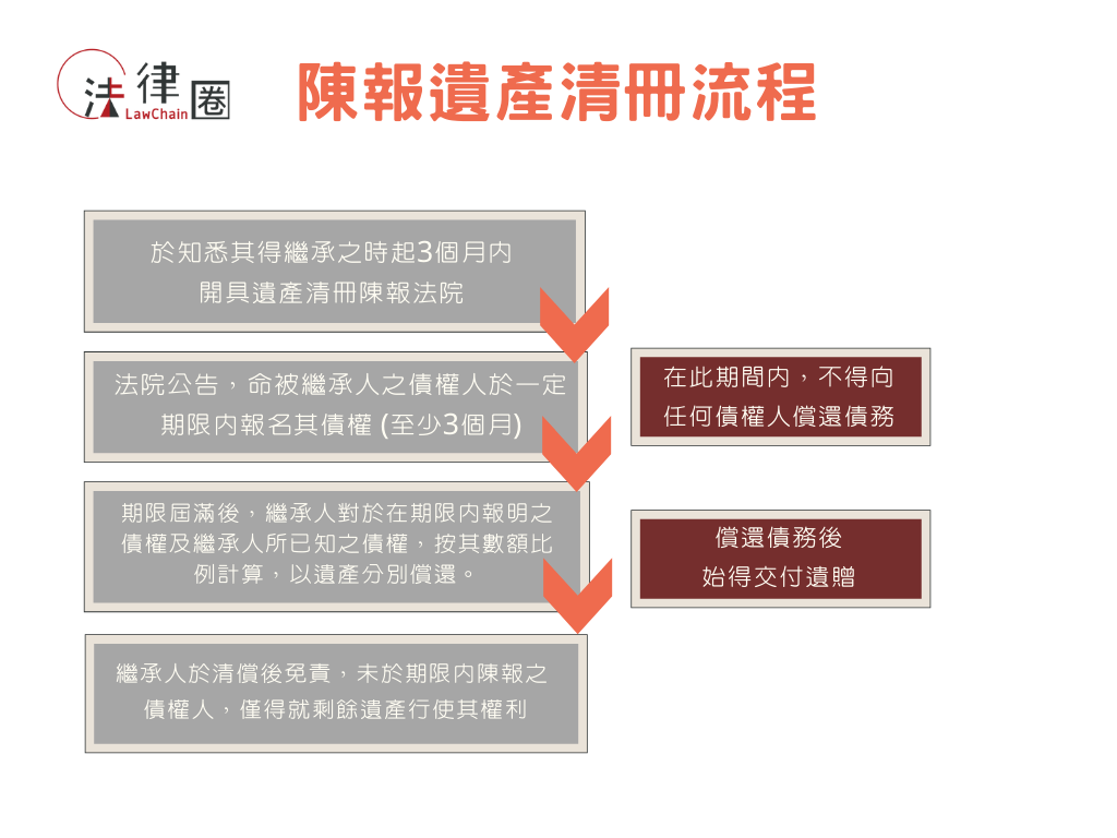 A : 依民法第1156、第1147條規定,於法定期間內進行陳報遺產清冊或拋棄繼承之程序,期間之起始點皆規定自「知悉其得繼承之時起」三個月內為之,以保障繼承人權益。