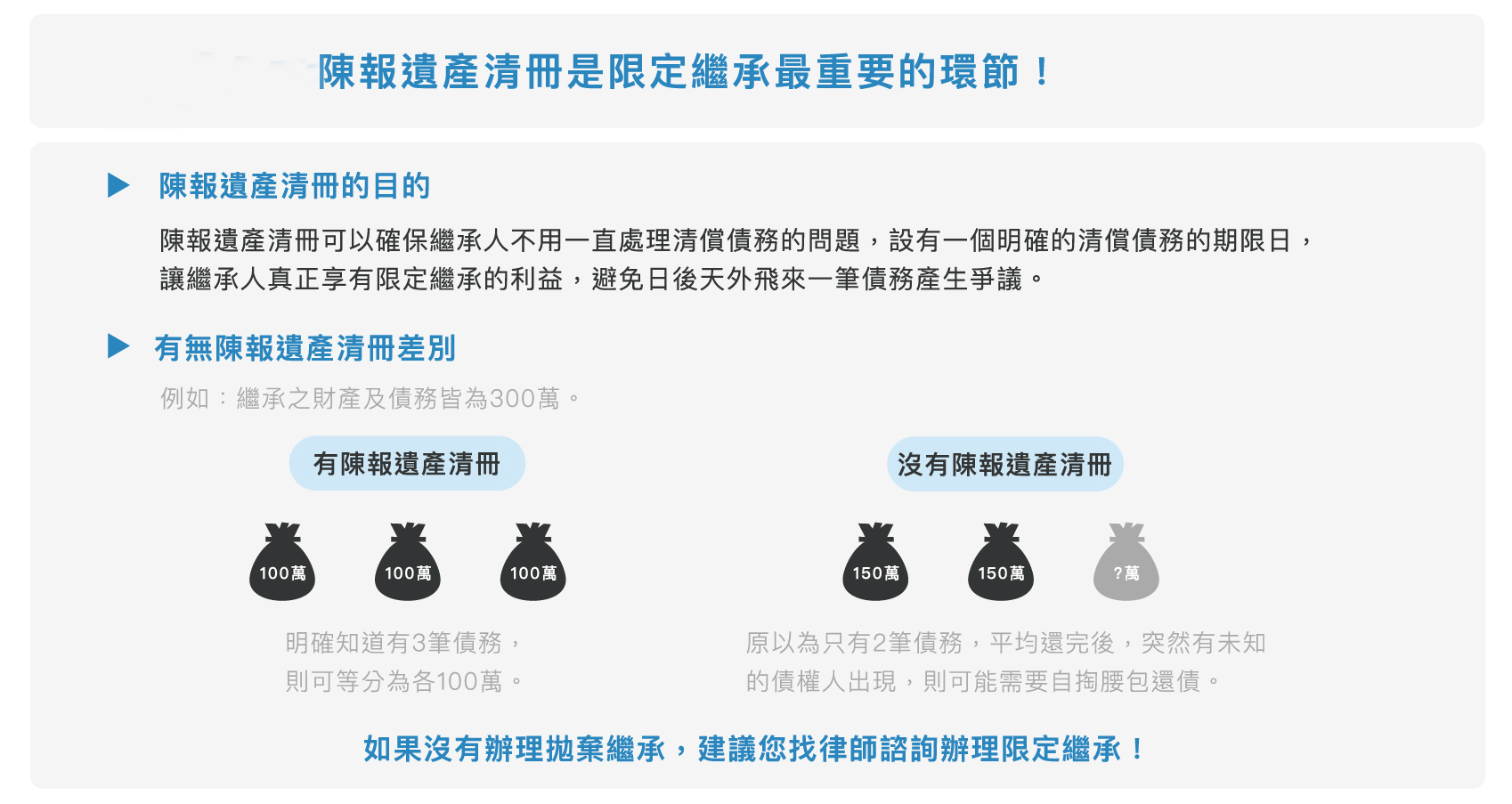 雖然民法規定,未拋棄繼承,就會以限定繼承來辦理,但仍應採取一定的措施,才能避免遭債權人求償。因此,建議繼承人仍要向法院陳報遺產清冊,才會知道有多少遺產和債務;為保障債權人,民法也有規定債權人可以聲請法院命繼承人陳報遺產清冊。