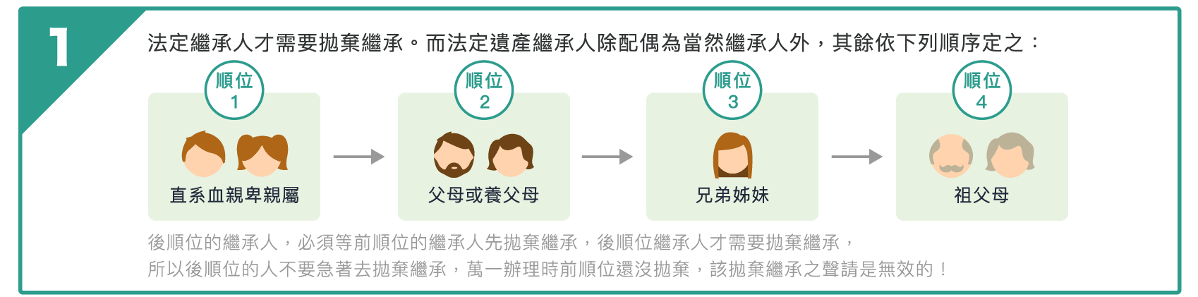 除了配偶是當然繼承人,一定有繼承權外;血親部分,直系血親卑親屬(第一順包含序,兒女、內外(曾)孫子女)、父母(第二順序)、兄弟姐妹(第三順序)與祖父母(第四順序)都是法定繼承人。而拋棄繼承只有對有辦理的人有效,沒有辦理的人還是會繼承,如果要辦理拋棄繼承,除了配偶外,也要記得依照拋棄繼承順位,通知所有繼承人。